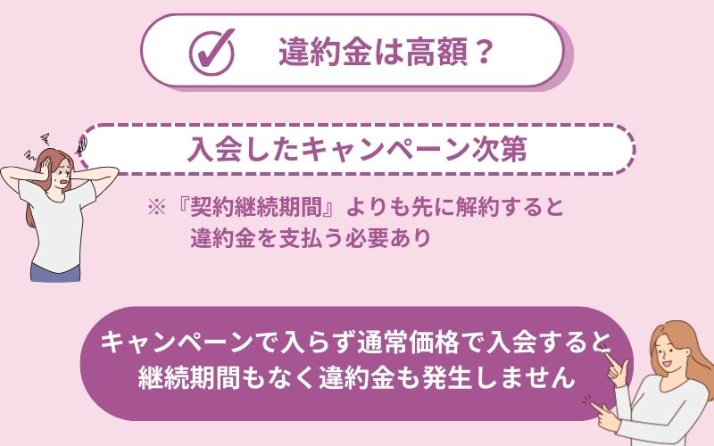 キャンペーンで入会すると、通常よりお得に通うことができます。 そしてキャンペーンを適応させるには、契約継続期間があり、その期間は解約手続きができません。 『契約継続期間』よりも先に解約すると、以下の違約金を支払う必要があります。- 事務手数料(¥0→¥5,500)を支払う