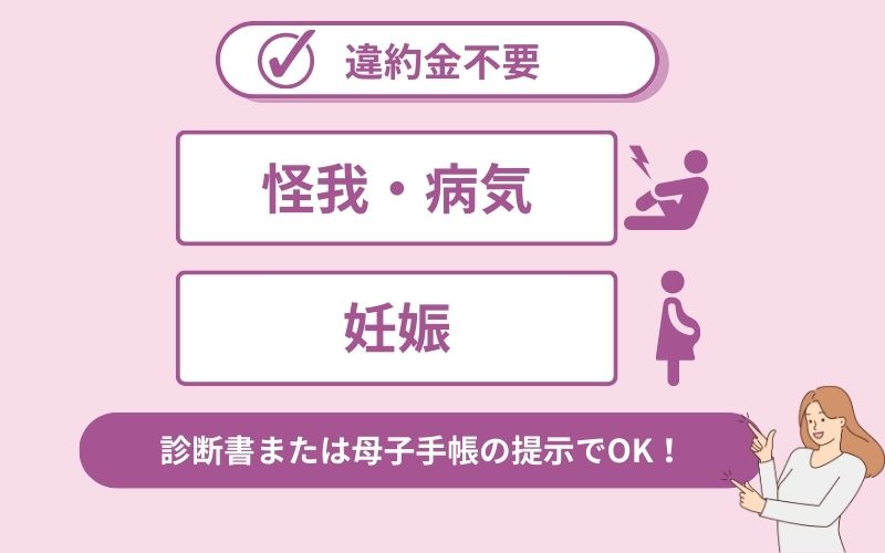 病気や怪我などでやむを得ず退会する場合は、違約金は発生しません。 医師による診断書の提示で、10日を過ぎていても月末で退会することができます。妊娠した場合