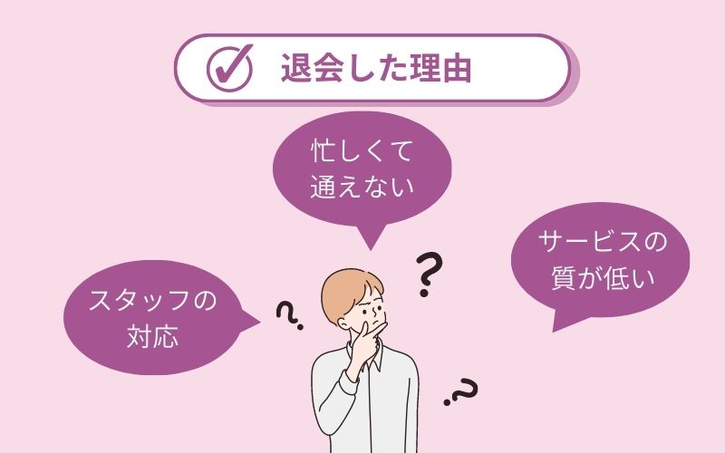フロントでの接客や会話など、スタッフの対応が悪すぎたという声もあります。 これはほんの一部かと思いますが、店舗によってスタッフ対応が適当であったり、スタッフ同士の私語が多いなど、気になることもあるようです。2.仕事が忙しくなって通うのが困難になった