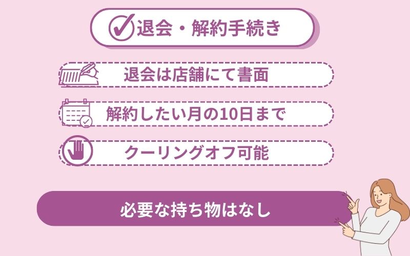 退会・解約手続きは店舗にて書面で行います。電話などでの手続きはできませんので、注意しましょう!