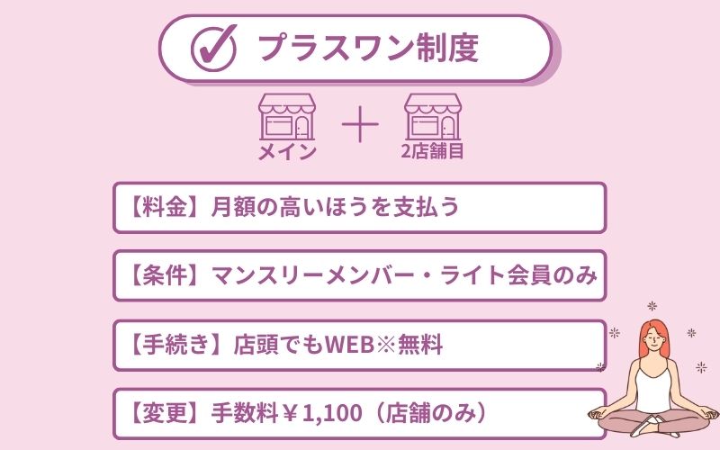 「プラスワン制度」とはマンスリーメンバー・ライト会員のみが利用できる制度で、2店舗利用が可能です。