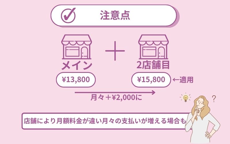 仮に、メイン店舗では¥11,800・プラス1店舗が¥13,800″の場合、メイン店舗の料金ではなく、月会費が高い「プラス1店舗」の¥13,800が適応されるというわけです。