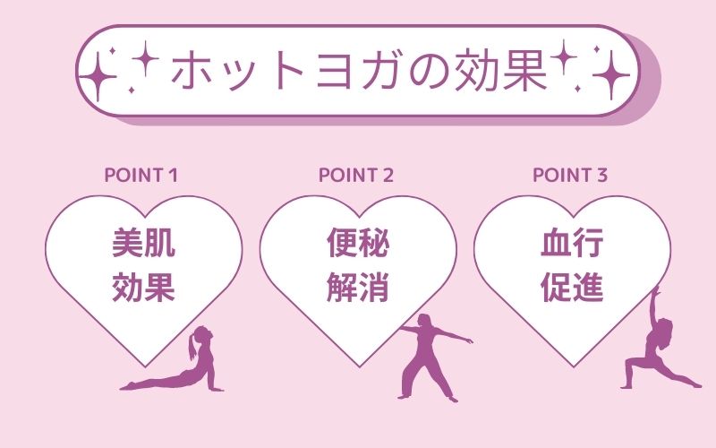 ホットヨガで大量の汗をかくことで細胞の水分代謝が上がり、身体の老廃物や毛穴の汚れを取り除いてくれます。また新陳代謝が高まることで肌のターンオーバーが活性化されます。 他にも、ホットヨガで流した汗は肌のペーハー(Ph)バランスに近く、天然の美容液として肌をきれいにしてくれるので美肌効果が非常に高いのです。2.便秘解消効果