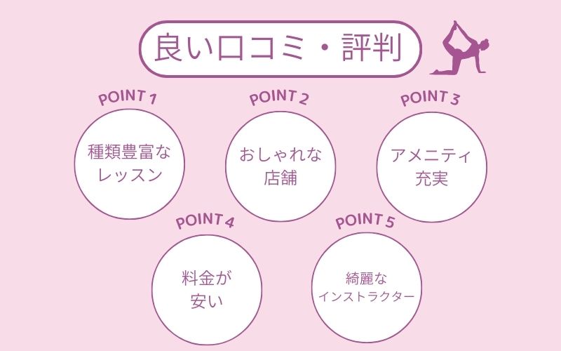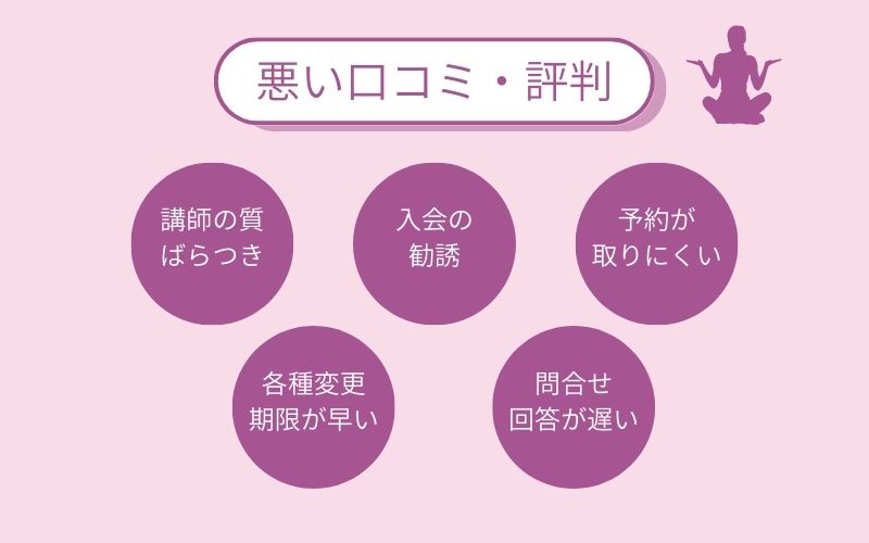 インストラクターの質はどんどん低下し、まともなレッスンができるインストラクターがいなくなった。レッスンも偏っていて無くなったレッスンもある。再開したサウンドフィールヨガもなんだかお遊戯みたいで、ガッカリ感しかない。コロナ前にいたスタッフはみんな、意識が高くて、レッスンも、接客も、スタイルも、笑顔も素敵でした。 引用元:みん評以前はインストラクターの質も高く接客もレッスンもよかったので心地よく通っていたという方が多かったですが、店舗によっては以前よりもレッスンの質が下がって残念という声が割と多く見られました。 ヨガインストラクターは体力も必要なサービス業なので、入れ替わりも激しいことからインストラクターのレベルにばらつきが出るのかもしれません。