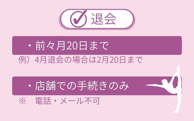 私はコロナ休会で手続きがややこしかったですが、届出書をみると、解約希望の人は引き落とし停止希望月の前々月20日まで(定休日の場合は前日)と書いています。 申請期限が早くて見落としがちですが、辞めたいと思っている人は参考にしてください! 引用元:みん評ロイブの解約・休会・コース変更の手続きは、適用したい月の『前々月の20日まで』と利用規約で決まっています。 他のスタジオに比べると、手続きを早く済ませなければ行けないため、急な変更や体調の変化などに合わせることは難しく、知らない間に期日を過ぎていた!という方も多いようです。