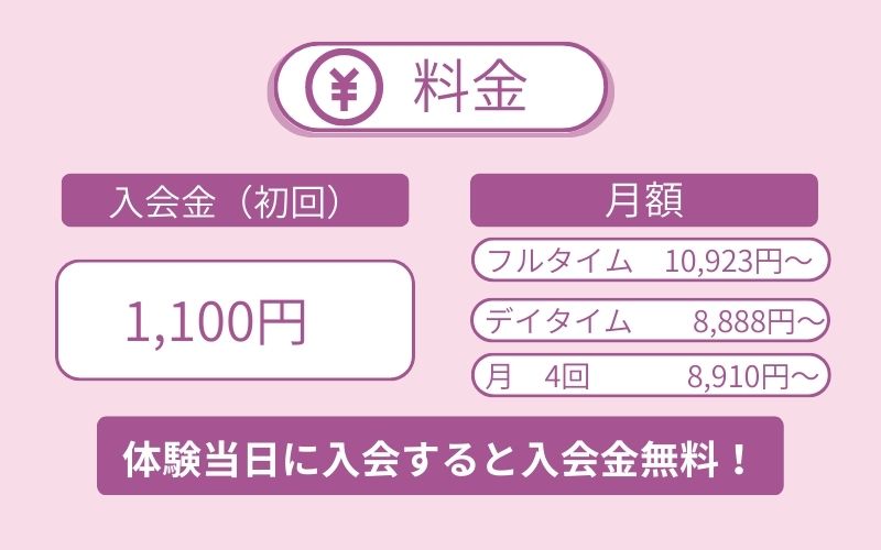 | 会員料金 | ・フルタイム ¥10,923〜¥15,620 ・デイタイム ¥8,888〜¥13,640 ・月4回 ¥8,910〜¥10,010 |